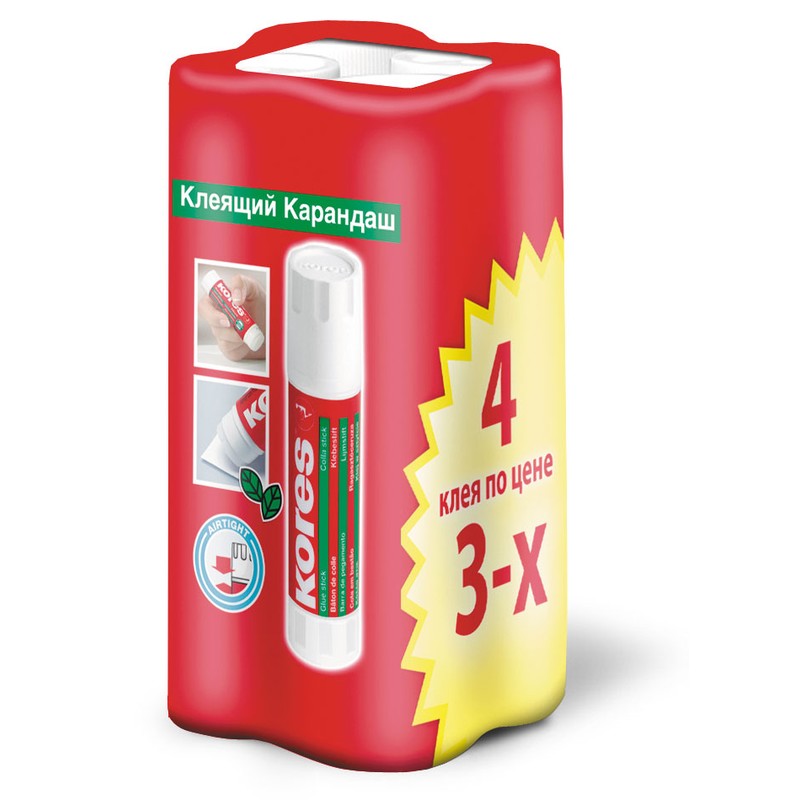 Клей-карандаш Kores является незаменимым помощником в офисах, школах, банках и т. д. Мягкий стержень легко наносится благодаря глицерину, в меру скользит, не оставляет видимых следов на руках, рабочей поверхности. Клей не имеет цвета и запаха, в его составе находятся нетоксичные антиаллергенные материалы. Таким клеем дети вполне безопасно могут мастерить поделки из бумаги, картона, природных материалов и текстиля. Приклеивание происходит через 30 секунд после нанесения клея. Каждая упаковка содержит 4 клея по 15 г, которые приобретаются по цене трех.
