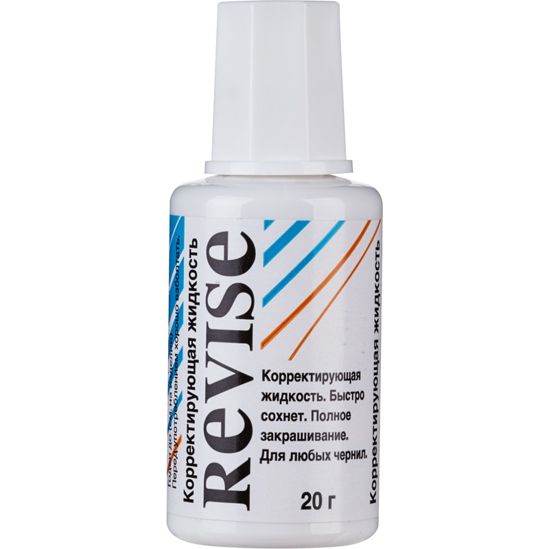 Корректирующая жидкость на быстросохнущей основе ReVise используется для внесения исправлений в документы всех типов, в том числе выполненные на бумаге для факсимильных аппаратов. Нанесенный на бумагу состав образует непрозрачный тонкий слой, ровный и гладкий, не портящий внешний вид документа. Находящийся внутри флакона небольшой шарик из металла при энергичном встряхивании позволяет вернуть составу однородность перед использованием. Рабочая поверхность кисточки выполнена из ворса. Во флаконе находится 20 миллилитров корректирующей жидкости.
