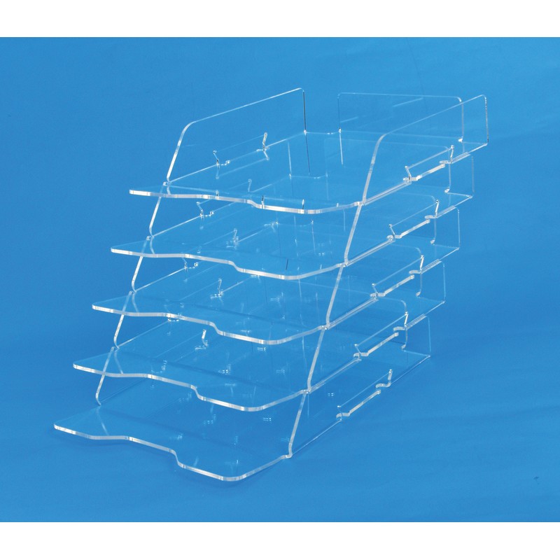 Лоток для бумаг «Лантан» горизонтальный имеет 5 отделений, расположенных друг над другом, каждое из которых смещено для удобства эксплуатации. Дополнительно надстраивать количество лотков нельзя. Предназначение – хранения листов формата А4. В качестве материала выступает стекло акриловое, толщина которого 3 мм. Цветовое решение – бесцветный, прозрачный.