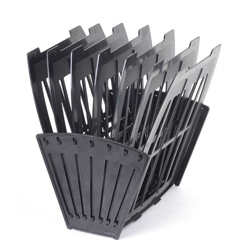 Универсальный лоток для хранения различных документов, журналов, бумаг формата А4. Выполнен из черного полистирола. Имеет компактные размеры и занимает всего 26 см в высоту. Имеет 6 отдельных секций,каждая из которых составляет 4 см. Благодаря своей конструкции, лоток может находиться на рабочей поверхности стола горизонтально или же вертикально. В силу отсутствия крепежных элементов на поверхности лотка, размещать его можно только в горизонтальной плоскости.