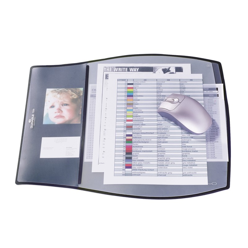 Настольный коврик Durable черного цвета. С тремя верхними прозрачными листами. Относительно небольшие размеры позволяют использовать его в качестве коврика для мышки. Изготовлен из нескользящего мягкого пластика. Размер — 39×44 см.