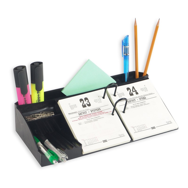 Подставка для перекидных календарей «Аврора» изготовлена из пластика черного цвета, размер — 310×150×75 мм. Дополнена отсеками для хранения ручек, небольших блокнотов и прочих канцелярских принадлежностей.