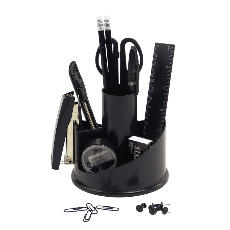 Канцелярский набор Attache JC806 практичный и эргономичный, помогает организовать порядок на рабочем месте. Его подставка имеет круглую форму, основа которой вращается на 360 градусов. Подставка достаточно вместительная, состоит из 14 разнообразных канцелярских предметов, которые размещаются в специальных удобных ячейках. Данный набор идеально подходит для хранения мелких предметов — скрепок, кнопок, точилок. Материал подставки — черный пластик.