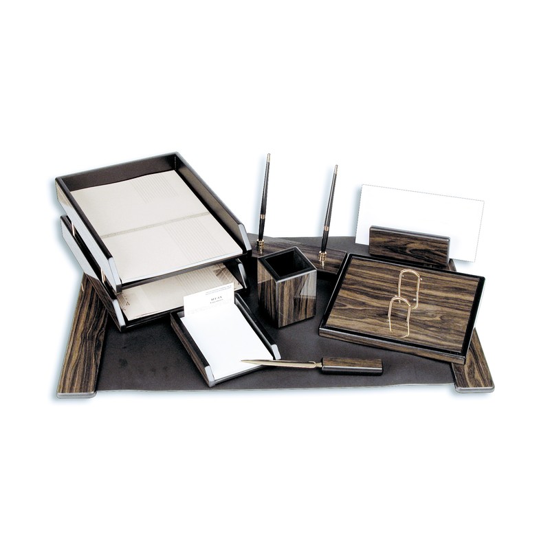 Этот набор отличается от всех остальных необычной цветовой окраской породы черного дерева. Благодаря контрастному сочетанию оттенков древесины, максимально подчеркивается структура деревянного изделия. Набор выглядит очень ярко и эффектно, привлекает внимание и подчеркивает ваше чувство стиля и вкуса. Комплект состоит из 8 единиц: двух лотков для бумаг, различных форматов, подставок для карандашей, ручек и визиток, канцелярского ножа и черного настольного коврика, окантованного двумя деревянными вставками по бокам.