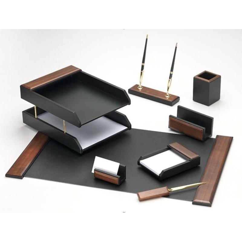 Настольные наборы помогут вам правильно хранить и систематизировать все ваши рабочие материалы и документы. Сделают ваше рабочее место аккуратным и убранным. А подобное исполнение входящих в них предметов, придадут вашему рабочему пространству определенный стиль и характер. Настольный набор канцелярских принадлежностей от Good Sunrise отлично справиться со всеми вышеописанными требованиями. Он состоит из подставок для карандашей, ручек, визитных карточек и конвертов. Также из различных по размеру лотков, канцелярского ножа и настольного покрытия. Все выполнено из очень качественной породы орехового дерева, с добавлением фурнитуры под золото.