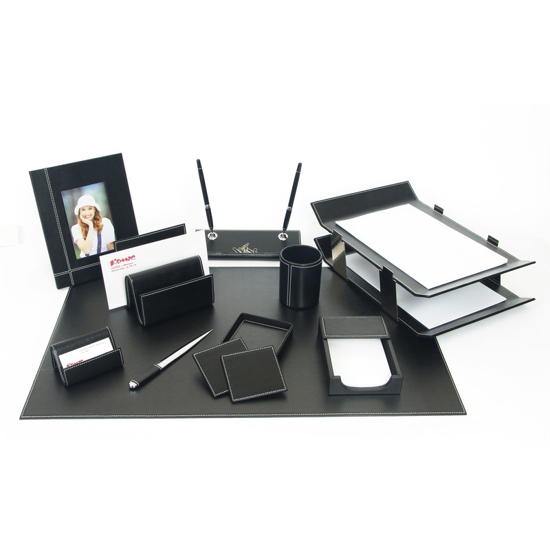 Набор из 10 предметов, выполнен из кожи черного цвета с декором белой прострочки, элементы металла серебряного цвета. Комплектация: подложка на стол (77х46 см); рамка для фотографий (10х15 см); подставка для ручек (2 шариковые ручки в комплекте); стильный 2-ярусный лоток для документов; подставка для писем; подставка под визитные карточки; стакан для пишущих принадлежностей; нож для писем; подставка с блоком бумаги для записей (10х15 см); держатель с 4 подставками под стаканы.