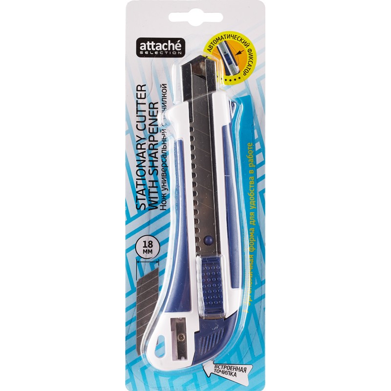Канцелярский промышленный нож Attache Selection используется в качестве режущего инструмента для бумаги, картона, с его помощью можно также аккуратно распечатать письма, посылки. Острое лезвие режет поверхности очень точно. Рукоятка ножа изготовлена из ударопрочного пластика синего цвета с антискользящим покрытием, ее дополняет встроенная точилка для карандашей. Лезвие ножа можно менять, его ширина составляет 18 мм.