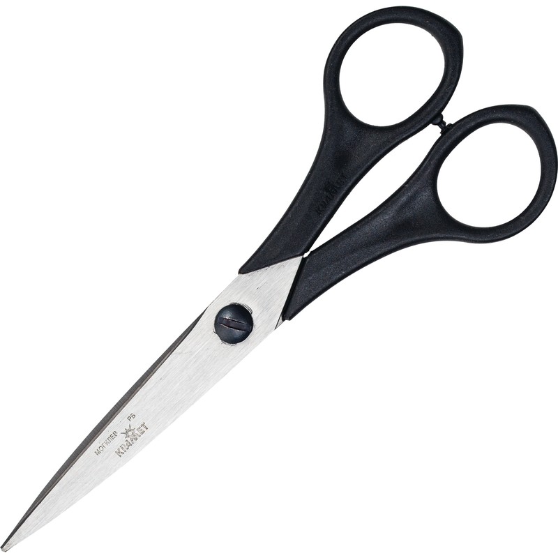 Канцелярские ножницы (офисные) «КраМет», подходящие для работы с материалами любой плотности. Лезвия, изготовленные из высокоуглеродистой легированной стали, снабжены регулировочным винтом, позволяющим установить удобный ход инструмента. Симметричные пластиковые кольца черного цвета удобны при работе. Длина ножниц — 16 см. Изделие упаковано в полупрозрачный чехол.