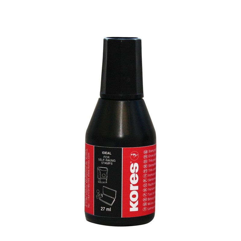 Штемпельная краска Kores на водно-масляной основе в пластиковом флаконе объемом 27 мл. Цвет черный. Дозатор обеспечивает равномерное нанесение на штемпельную подушку. Подходит для использования со всеми видами резиновых штампов.
