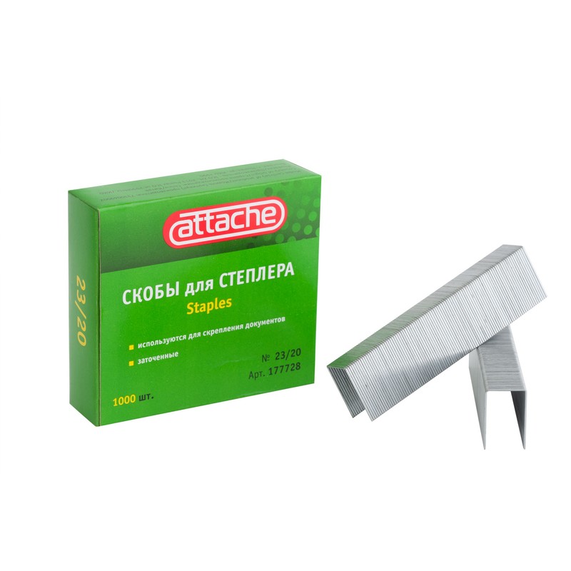 Скобы для степлера № 23/20 Attache предназначены для степлеров со сшивающей способностью до 180 листов. Скобы № 23/20 выполнены из металла с никелированным покрытием. 1000 скоб в картонной пачке.