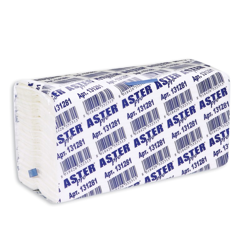 Полотенца бумажные листовые Aster Pro 2-слойные белого цвета, С-сложения. Изготовлены из целлюлозы.