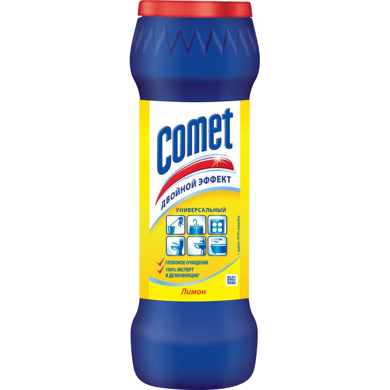 Порошкообразное чистящее средство для кухни Comet, содержащее хлоринол и абразивный компонент на меловой основе, удаляет пятна внутри поверхности. Средство эффективно для очищения таких поверхностей, как плита, кухонная мебель, кафель, унитаз, раковина, ванна. Поставляется в упаковке 475 г.
