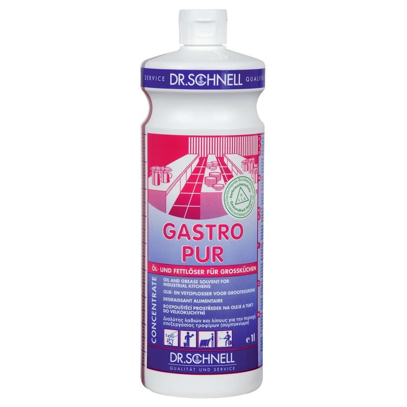 GASTRO PUR представляет собой концентрированное средство для профессиональной уборки кухни. Может применяться как в домашних условиях, так и в различных учреждениях. Превосходно растворяет масло, остатки пищи, пятна жир и грязи, в том числе и застарелые. Подходит для чистки любых поверхностей — нержавеющей стали, стекла, плитки, линолеума и фарфора. Имеет нейтральный запах. Экологически безопасно, не содержит хлора и фосфатов. Рекомендуемая дозировка от 0,25% до 30 % в растворе, в зависимости от степени загрязнения. На упаковке объемом 1 л находится мерная шкала.