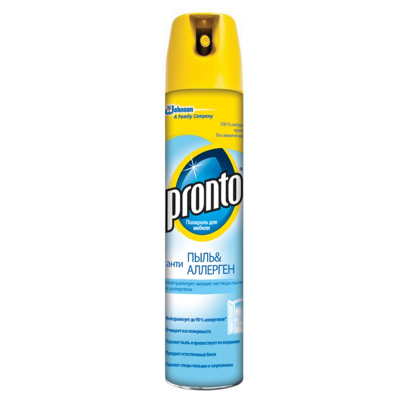 Аэрозольный полироль Pronto «Антипыль, антиаллерген» эффективно удаляет загрязнения со всех поверхностей в помещении, а также нейтрализует аллергенные частички пыли. Специальный состав обеспечивает мягкое очищение деревянных, керамических, мраморных и эмалированных материалов. Обработанные поверхности надолго сохраняют сияющий глянец. Средство подходит для уборки детских комнат. Объем баллона — 250 мл. На выбор предлагаются разнообразные отдушки.