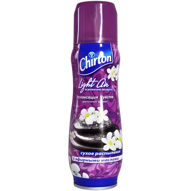 Освежитель воздуха (аэрозоль) Chirton Light Air «Релаксация чувств» наполняет помещение приятным ароматом и избавляет от не приятных запахов, освежает воздух. Баллон имеет объем 300 мл. Не содержит озоноразрушающих веществ. Освежитель воздуха протестирован, не оставляет пятен и следов на мебели и обоях.