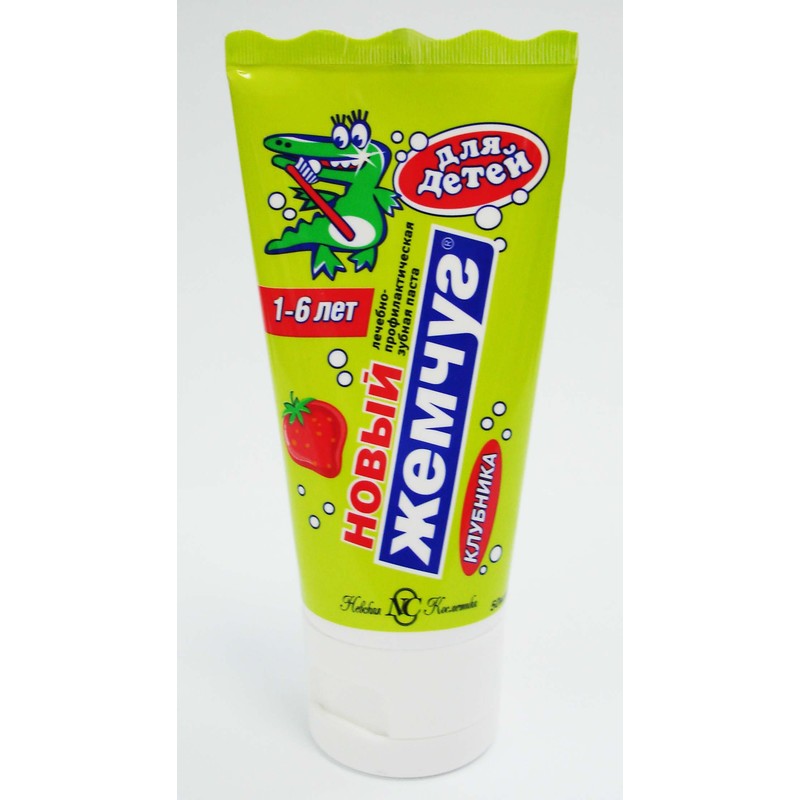 Детская зубная паста «Новый жемчуг» в 50-миллилитровой пластиковой тубе. Изделие предназначено подходит детям в возрасте от 1 года до 6 лет. Зубная паста имеет лечебно-профилактический состав с мягким клубничным вкусом, безопасна для желудка в случае проглатывания.