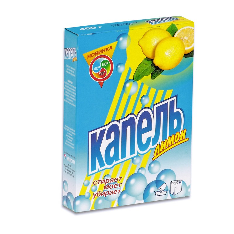 Универсальный порошок «Капель» с ароматом лимона эффективно борется со всеми видами загрязнений при ручной стирке и в стиральных машинах активаторного типа. Порошок также можно использовать в хозяйстве как эффективное чистящее средство. Содержит добавки против аллергии и для сохранности волокон ткани. В картонной упаковке 400 г.