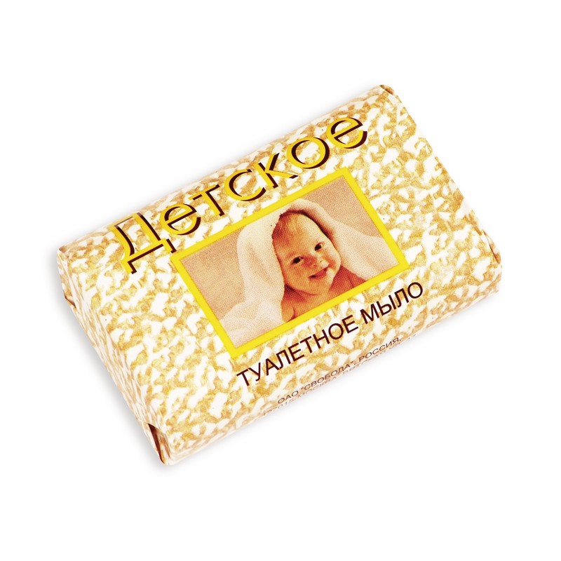Туалетное мыло «Детское» содержит уникальный комплекс витаминов и глицерин, которые оказывают питающее и увлажняющее воздействие. Детское мыло кусковое изготовлено без использования красителей и агрессивных моющих веществ, рекомендуется для чувствительной кожи детей любого возраста. Не имеет отдушек. Масса нетто — 100 г.