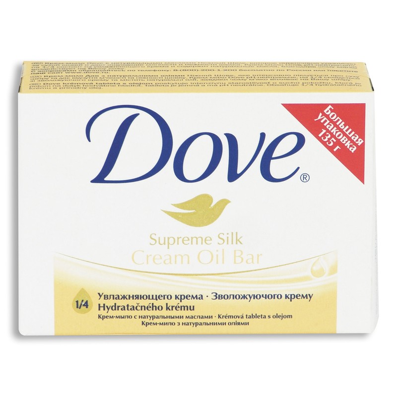 Туалетное мыло Dove — мягкое очищающее средство, которое на четверть состоит из увлажняющего крема и не содержит щелочи (в отличие от обычного мыла). Dove бережно заботится о коже, поддерживая естественный уровень увлажненности. Отдушки в ассортименте: «Сияние шелка», «Прикосновение свежести», «Оригинальное». Вес — 135 г.