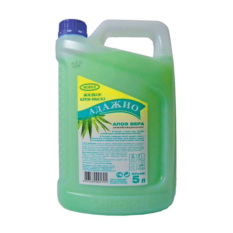 Жидкое мыло «Адажио Алоэ вера» в канистре объемом 5 литров. Удобно наливать во флакон с дозатором. Мыло имеет приятный аромат, кремовая основа ухаживает за кожей рук и тела. Эффективно очищает и дезинфицирует. Жидкое мыло содержит антибактериальный компонент (триклозан), который оказывает антисептическое действие и защищает от образования новых бактерий. Подходит для ежедневного использования.