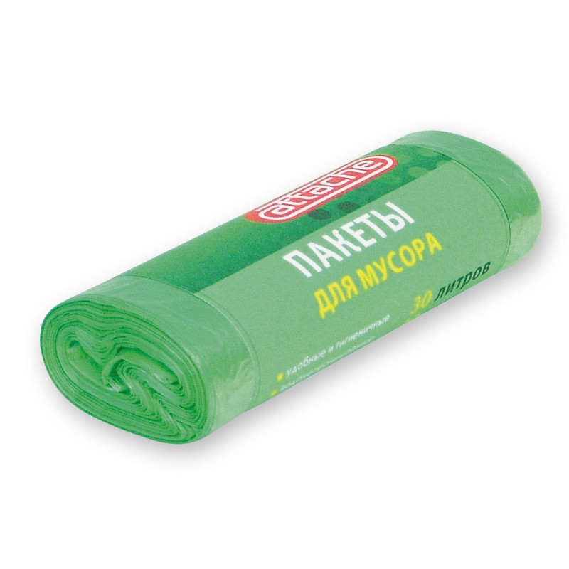 Пакеты для мусора Attache изготовлены из полиэтилена низкого давления. Объём — 30 литров. Упаковка — по 30 штук в рулоне. В транспортной упаковке 60 рул. Плотность — 10 мкм. Размер пакета 50×60 см. Оригинальный зелёный цвет.