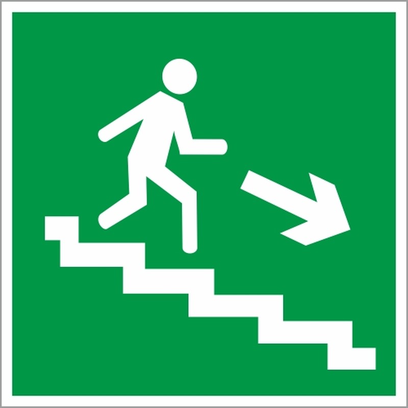 Знак безопасности E13 «Направление к эвакуационному выходу по лестнице вниз (правосторонний)», предназначенный для установки на стенах, прилегающих к лестничному пролету, а также на лестничных площадках. Знак квадратной формы с изображением белого цвета на зеленом фоне изготовлен из пленки ПВX c фотолюминесцентным покрытием. Хорошо держится на любом материале благодаря самоклеющейся основе. Размер — 200×200 мм.