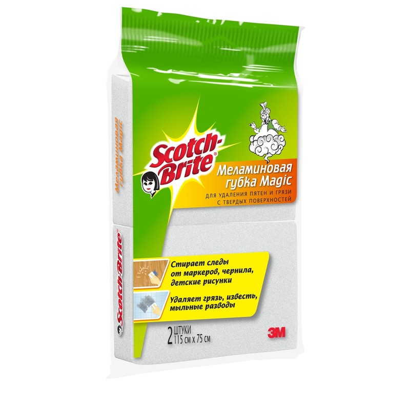 Губка мeламиновая для твердых поверхностей 3М Sсotch-Britе изготовлена из пластика нового поколения — меламиновой резины, способной эффективно очищать без применения химических средств стойкие загрязнения твердых поверхностей, включая чернила перманентного маркера. Губка обладает специфической структурой, при намачивании захватывает и впитывает грязь, не оставляет после себя царапин, разводов и следов. В упаковке две штуки.