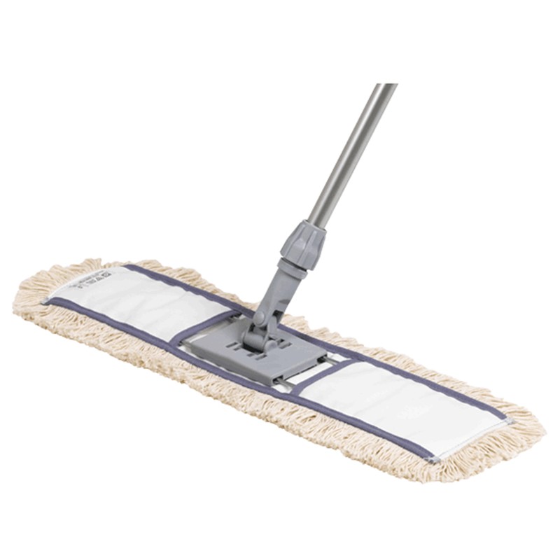 Швабра «ДастМоп» состоит из насадки шириной 60 см и металлической рукоятки длиной 150 см. Предназначена для уборки всех типов твердых полов. Конструкция обеспечивает плотный прижим насадки к очищаемой поверхности. Насадка изготовлена из хлопка (70%), полиэстера (25%) и вискозы (5%), подкладка — из полиэстера. Все петли прошиты отдельно и со временем не скатываются в ряды, что повышает эффективность и увеличивает срок службы. Швабра подходит для уборочных тележек.