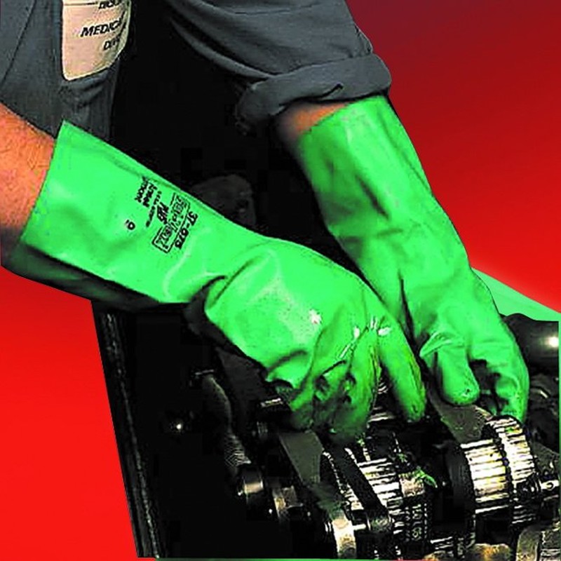Перчатки Ansell «Солвекс» (размер 10) демонстрируют отличную механическую прочность и стойкость к спиртам, нефтепродуктам, органическим растворителям, кислотам (до 80 %). Выполнены из высококачественного нитрила, превосходящего по своим защитным свойствам бутилкаучук. Рифленый наружный слой изделий обеспечивает надежный хват, а хлопковое напыление внутри перчатки с антибактериальной обработкой предотвращает раздражение кожи рук.. Изделия толщиной 0,35 мм рекомендуются к использованию в тяжелой и химической промышленности. Длина перчаток 33 см.
