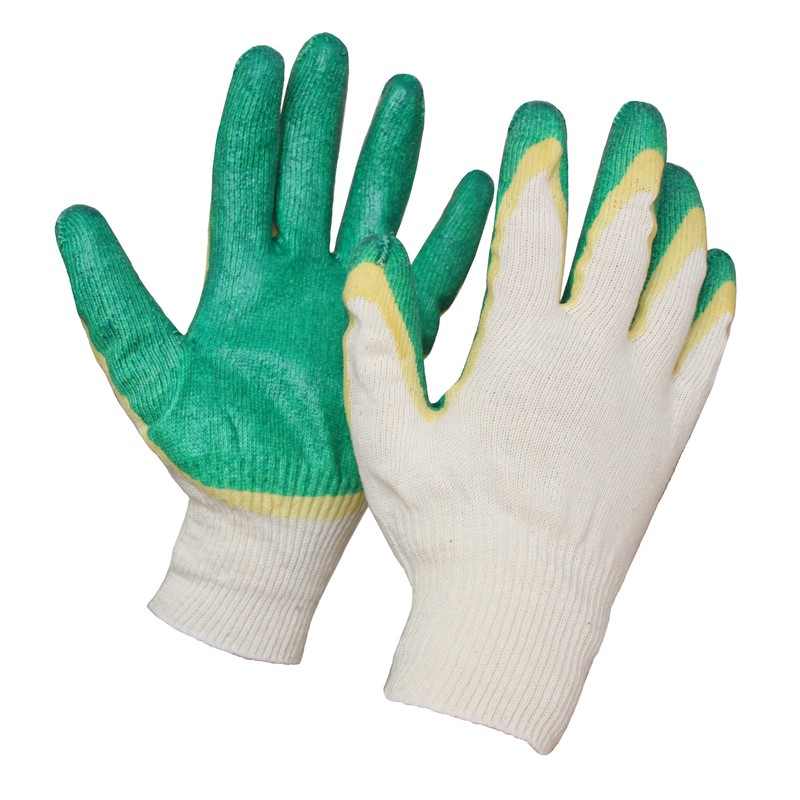 Перчатки трикотажные с двойным латексным покрытием предназначены для защиты рук от истирания и механических воздействий. Имеют основу из 100% хлопка, которая на ладонной части и пальцах имеет покрытие из 2 слоев латекса зеленого цвета. Перчатки обеспечивают повышенные сцепные свойства.