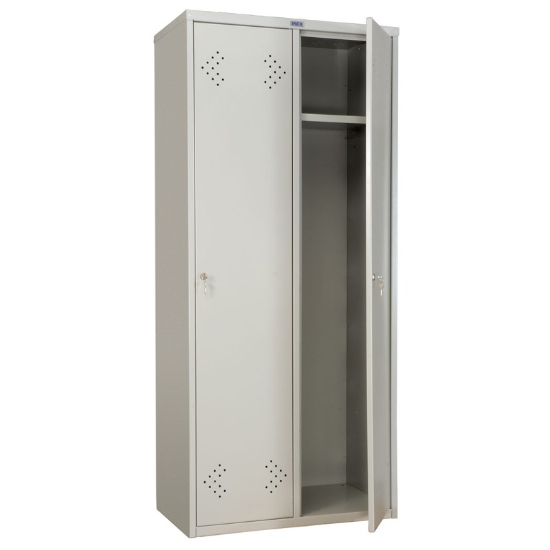 Металлический шкаф «Практик» серии LS-21-80 (LE-21-80), предназначенный для хранения одежды в производственных, спортивных и других помещениях. Каркас с антикоррозийным покрытием изготовлен из высококачественной листовой стали. Шкаф состоит из двух отделений, каждое их которых закрывается на ключевой замок с возможностью смены цилиндра. Внутри имеется полка, перекладина и крючки. Вентиляционные отверстия обеспечивают проветривание отделения. Предусмотрена возможность крепления нескольких секций шкафов между собой. Размер шкафа — 813×500×1830 мм.