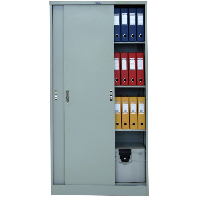 Архивный шкаф-купе Практик изготовлен из металла с порошковым покрытием серого цвета. Размеры — 183×91,5 см, глубина — 45,8 см. Раздвижные двери с роликовым механизмом позволяют использовать шкаф в условиях ограниченного пространства. Внутри три полки, высоту которых можно регулировать. Вмещает большой объем документов, удобен для хранения архивных папок. Шкаф-купе оборудован ключевым замком.