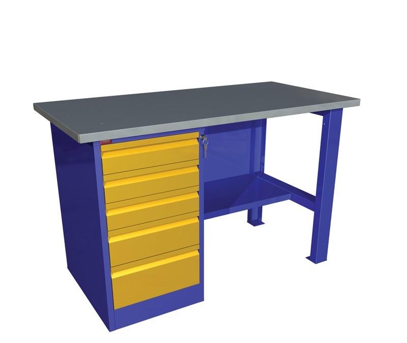 Однотумбовый верстак, состоящий из отдельных модулей: верстачной опоры, столешницы из МДФ с оцинковкой и полки. Тумба оборудована пятью выдвижными ящиками. Металлические элементы покрыты порошковой краской синего цвета. Модель может комплектоваться перфорированным экраном соответствующего размера с возможностью крепления крючков и держателей для инструмента. Верстак поставляется со всеми необходимыми комплектующими. Размеры изделия — 1390×685×860 мм.