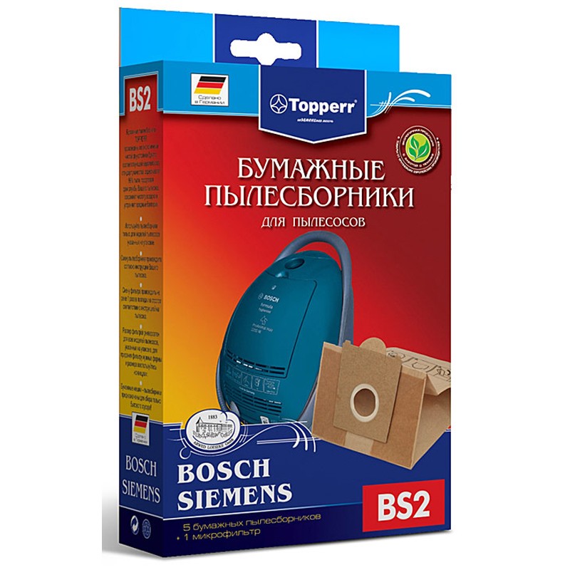 Бумажные пылесборники BS2 для пылесосов BOSCH и SIEMENS изготовлены из экологически чистой двухслойной бумаги, соответствующей европейскому стандарту качества, задерживают 99% пыли, продлевая срок службы пылесоса, сохраняют чистоту воздуха и устраняют вредные бактерии. Подходит для арт. 217968, 517250 и 517251