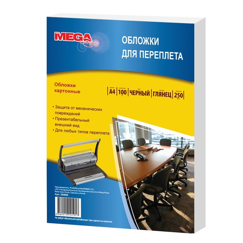 Название торговой марки ProMEGA Office Торговая марка ProMEGA Office Материал картон Формат 216х303 (А4) Страна происхождения Китай Цвет внешней поверхности чёрный Текстура материала глянцевая Плотность обложки 250 г/кв.м Количество в упaковке 100 шт. Артикул 254609 -