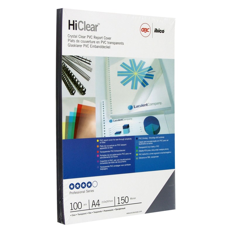 Обложки для переплета GBC формата А4 выполнены из прозрачного пластика толщиной 150 мкм. Используются при работе с брошюровщиками (совместно с пружинами). Придают документам презентабельный вид, защищают их от загрязнений и повреждений. Обеспечивают видимость титульного листа. В упаковке 100 штук.
