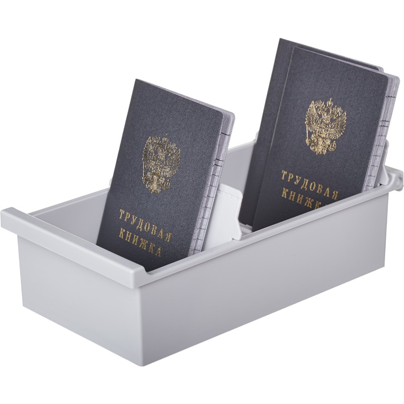 Открытая горизонтальная картотека Exacompta формата А7 изготовлена из пластика серого цвета, размеры — 225×123×65 мм. Предназначена для удобного хранения и систематизации карточек и документов. Вмещает до 600 карточек или 20 трудовых книжек (в комплект не входят). Картотека поставляется с двумя пластиковыми разделителями. Размер разделителя — 116×80 мм, размер табулятора — 34×22 мм.