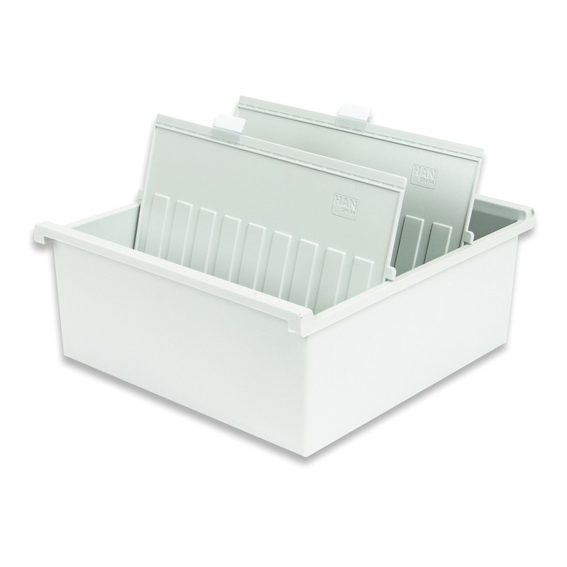 Открытая горизонтальная картотека Han формата А4 изготовлена из пластика светло-серого цвета, размеры — 347×325×140 мм. Предназначена для удобного хранения и систематизации карточек и документов. Вмещает до 1300 картонных карточек (в комплект не входят). Картотека поставляется с двумя пластиковыми разделителями и двумя прозрачными индексными окнами. Всего можно установить до 26 разделителей (приобретаются отдельно).