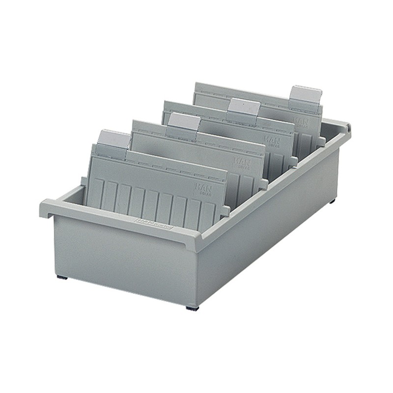 Открытая горизонтальная картотека Han формата А5 изготовлена из пластика серого цвета, размеры — 347×228×96 мм. Предназначена для удобного хранения и систематизации карточек и документов. Вмещает до 1300 картонных карточек (в комплект не входят). Картотека поставляется с двумя пластиковыми разделителями и двумя прозрачными индексными окнами. Всего можно установить до 26 разделителей (приобретаются отдельно).