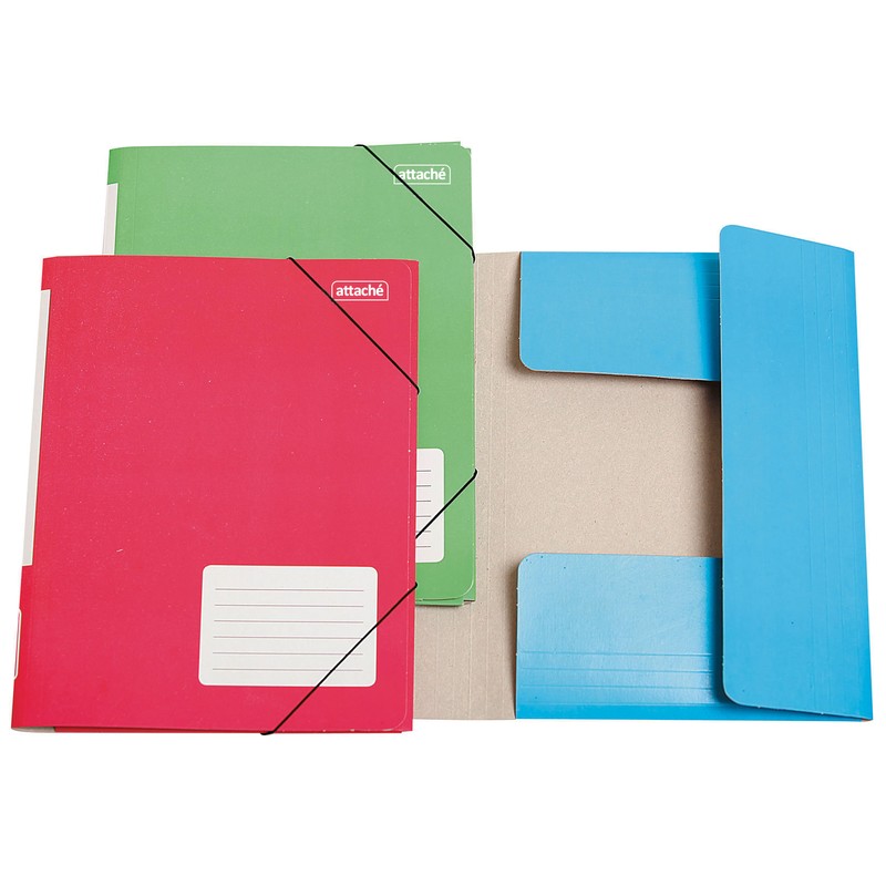 Папка Attache формата А4 выполнена из мелованного картона плотностью 400 г/кв.м. Оснащена двумя угловыми резинками, которые надежно удерживают ее в закрытом состоянии. Ширина корешка — 20 мм. Имеет три боковых клапана, благодаря чему документы не выпадают. Вмещает до 180 листов стандартной плотности. Папка представлена в разных цветовых вариантах.
