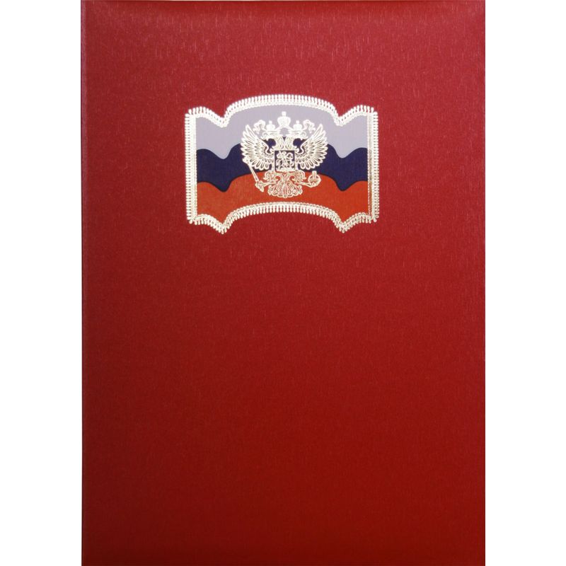 Адресная папка формата А4 выполнена из балакрона (ПВХ с имитацией кожи) красного цвета. На обложке изображение российского флага, на которое с помощью тиснения золотой фольгой нанесены окантовка и герб.