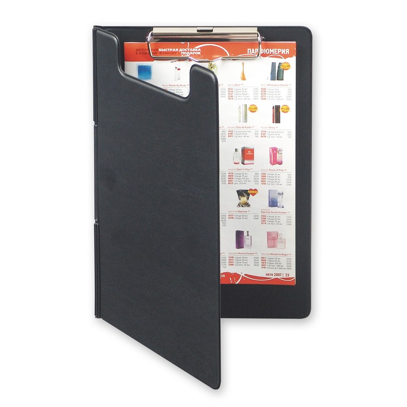 Папка-планшет изготовлена из плотного картона, обтянута ПВХ. Толщина — 1,9 мм. Формат А5. Цвет — черный. Возможно изготовление в корпоративных цветах (от 250 штук).