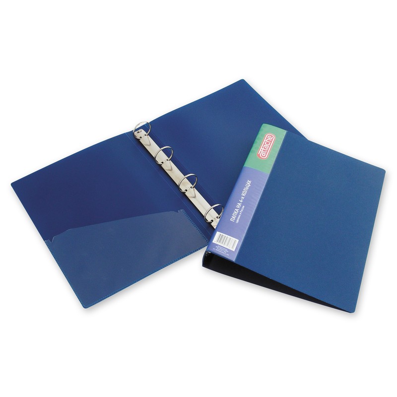 Папка на четырех кольцах Attache изготовлена из пластика толщиной 0,7 мм синего цвета. Формат А4. Снабжена механизмом на четырех O-кольцах. Диаметр кольца — 35 мм. На внутренней обложке есть прозрачный карман для документов. Ширина корешка составляет 42 мм. На корешке есть наварной карман размером 9,5x30 см. Папка на кольцах вмещает до 200 листов стандартной плотности.