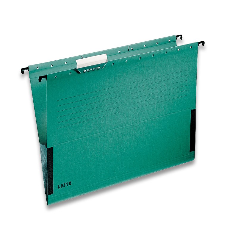 Подвесная папка Leitz формата А4 выполнена из плотного картона зеленого цвета. Предназначена для размещения в подвесной регистратуре (по бокам имеются специальные крючки). Оснащена передвижным табулятором (разделителем) со сменной этикеткой для маркировки. Размеры без учета крючков — 318×270 мм, с крючками 348×270 мм.