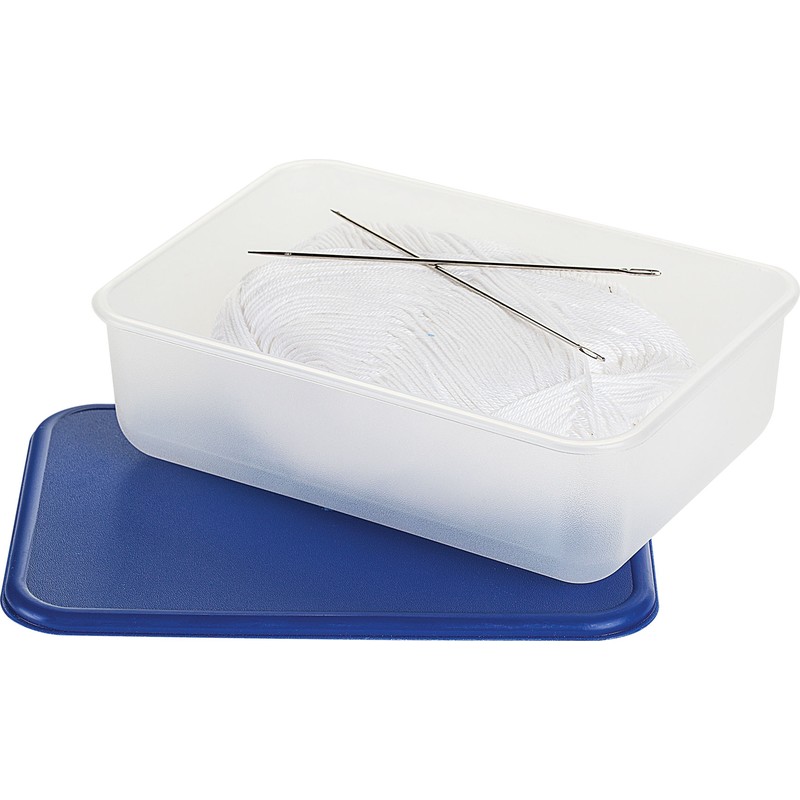 Набор для сшивания документов. В комплект входит 1 моток высококачественных хлопчатобумажных ниток толщиной 1,4 мм белого цвета (длина намотки 250 метров) и 2 стальные иглы с ушком. Набор поставляется в герметичном пластиковом боксе, для последующего хранения.