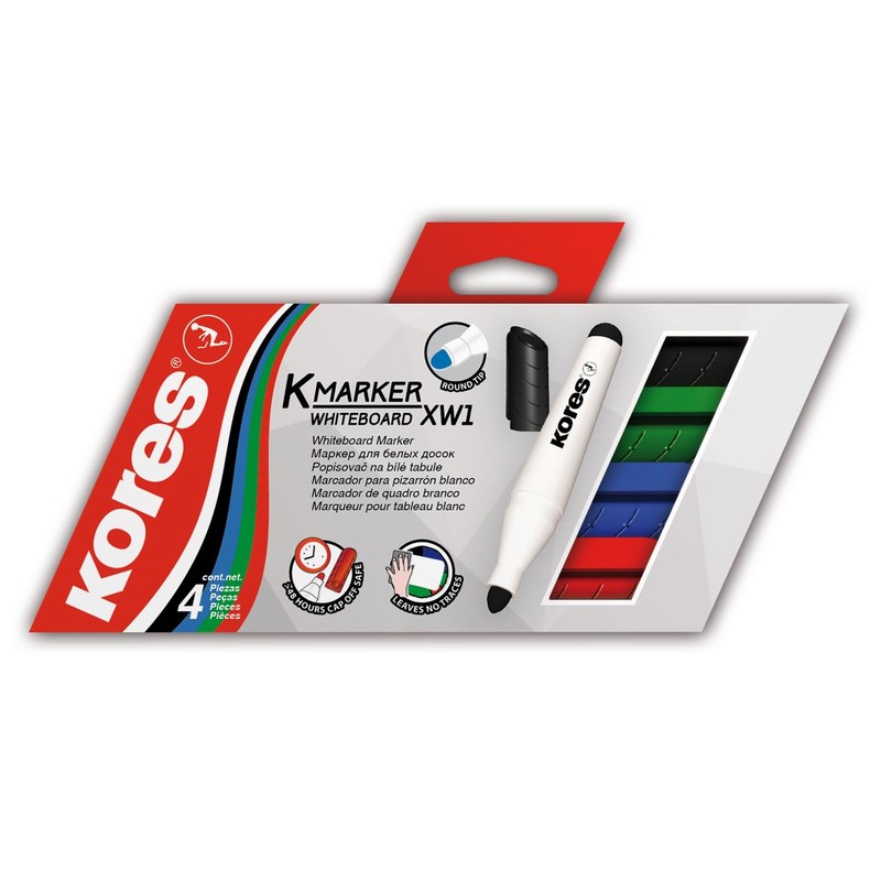 Набор маркеров для досок KORES '20843 Круглый наконечник. Пластиковый корпус. Толщина линии письма - 3мм Цвета: черный, синий, красный, зеленый. Стираются с таких гладких поверхностей, как пластик, стекло и эмаль, сухим способом.