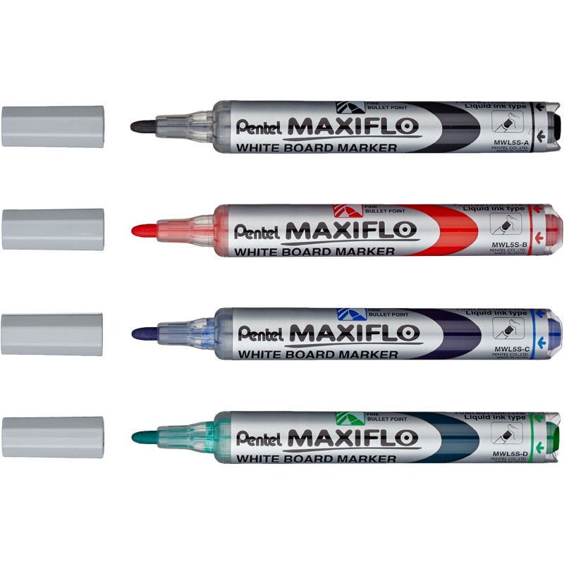 Набор маркеров для досок PENTEL MWL5S-4N + губка. Круглый наконечник. Пластиковый корпус. Толщина линии письма - 4мм Цвета: черный, синий, красный, зеленый. Комплект включает губку для удаления надписей с досок. Губка имеет магнитную вставку для крепления на металлических досках. Маркеры оснащены подкачкой чернил в стержень и стираются сухой губкой.