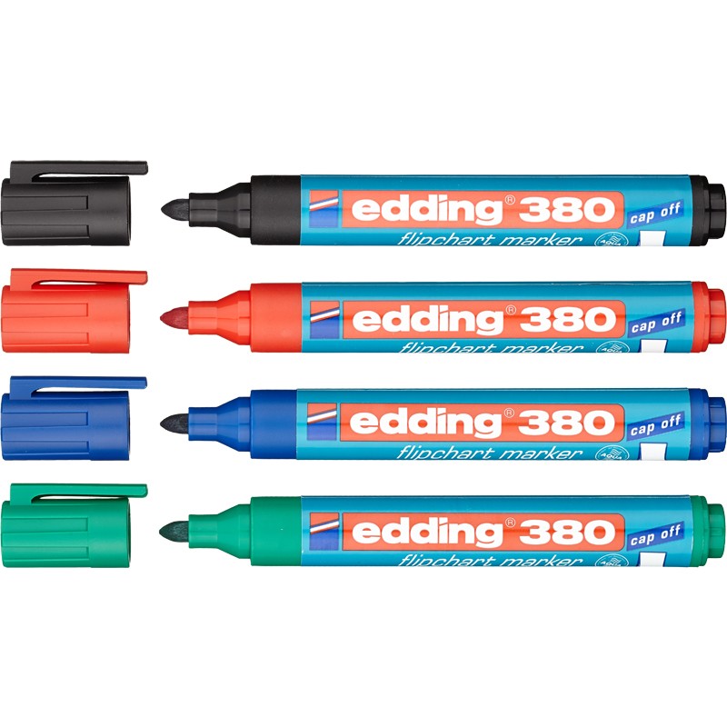Набор маркеров для флипчартов Edding E-380/4S с технологией "cap off" Круглый наконечник. Пластиковый корпус. Толщина линии письма: 2.2мм Цвет: черный. синий, красный, зеленый. Производство - Германия.