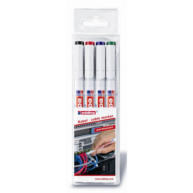 Набор из четырех маркеров Edding черного, красного, синего и зеленого цвета предназначен для удобной работы с разными видами кабелей и другими узкими предметами. Тонкая линия письма — 0,3 мм, водостойкие чернила.