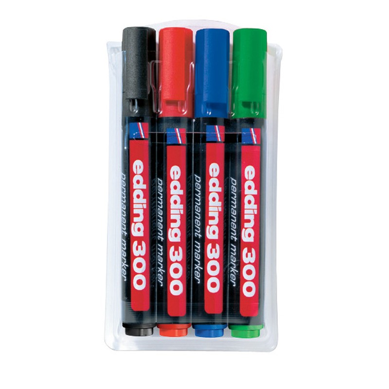 Набор перманентных маркеров Edding E-300 в пластиковом корпусе. Светостойкие чернила на спиртовой основе. Круглый наконечник позволяет провести линию толщиной 1,5-3 мм. Страна производства — Германия. В наборе 4 цвета: синий, черный, зеленый, красный.